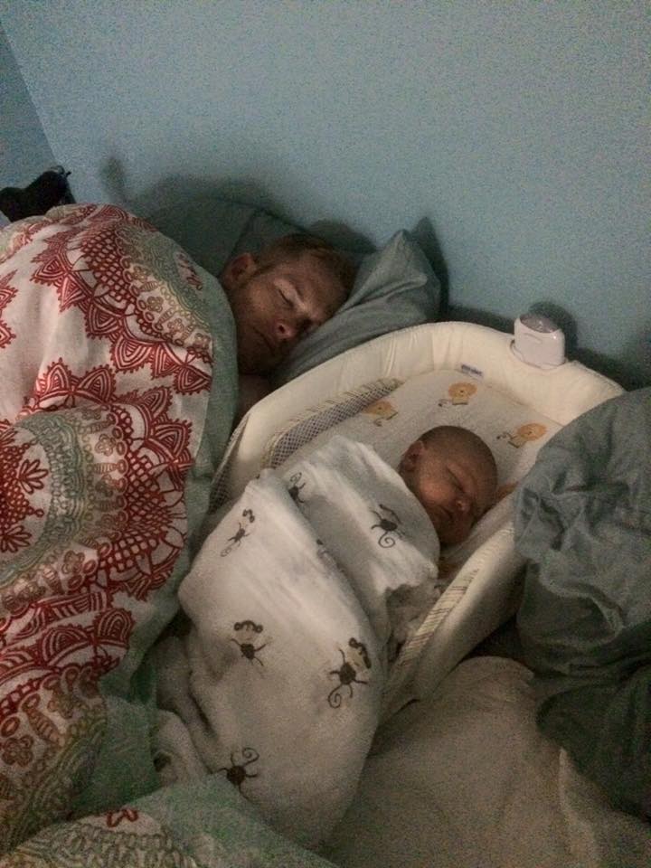 Sleeping next to daddy in her co-sleeper