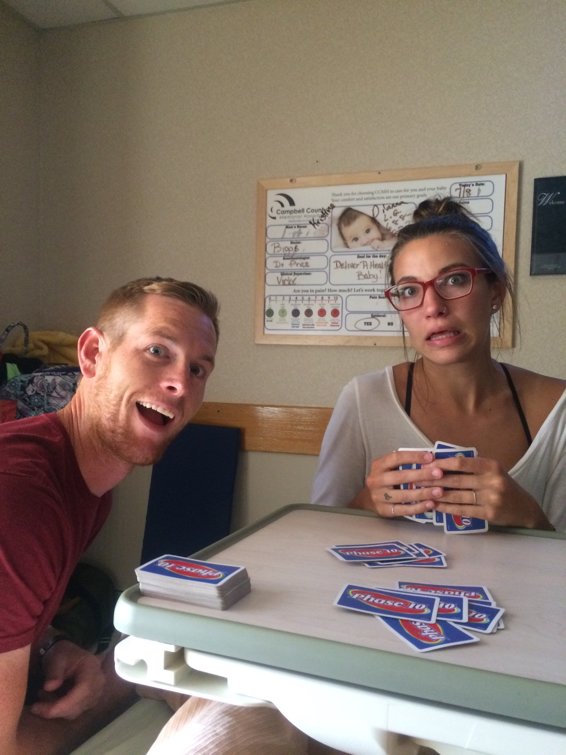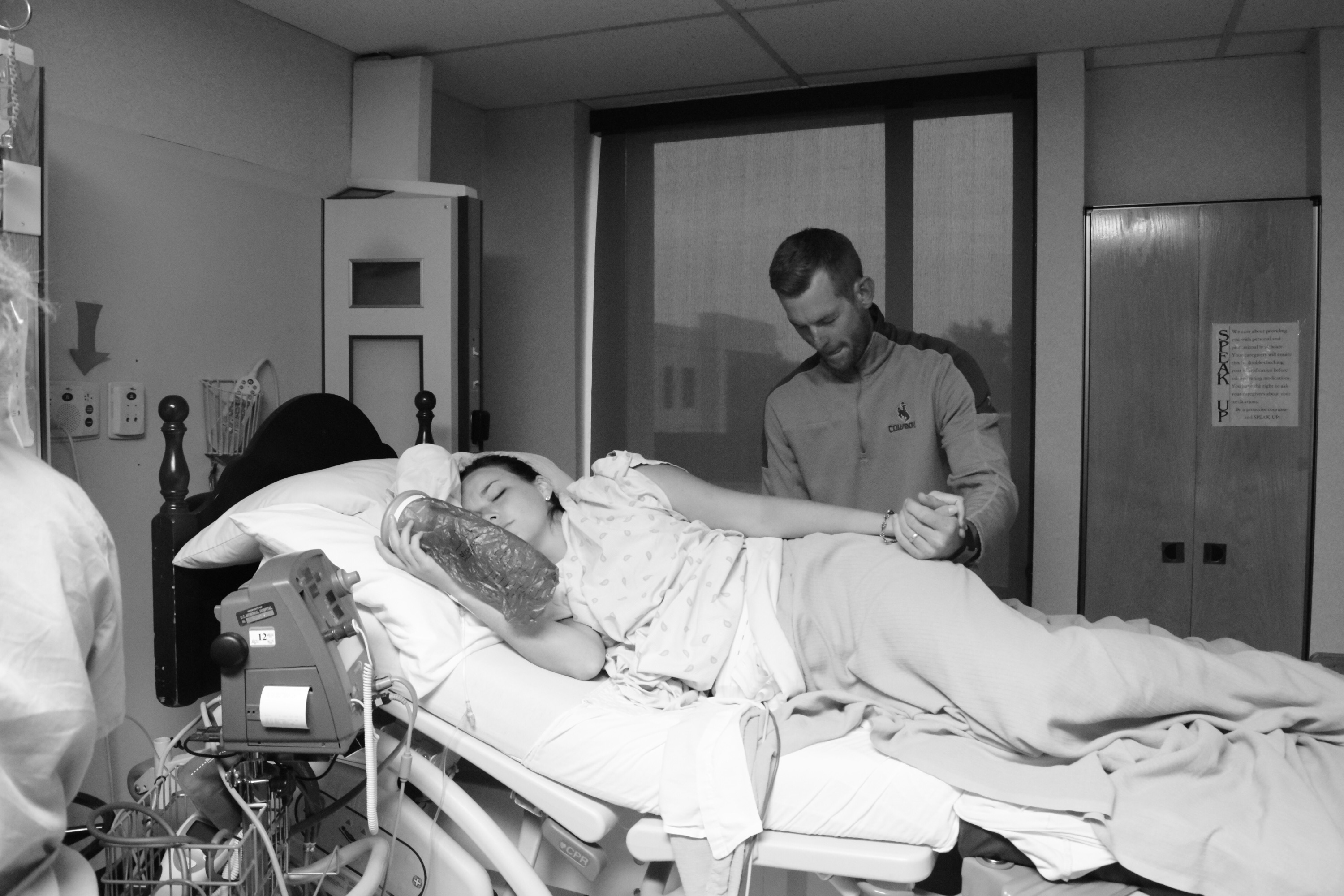 I came prepared to do this thing naturally! No drugs, no needle! Well, after throwing up my tatertot casserole several times, not sleeping, and being in excruciating pain, I started to doubt myself and my pain tolerance. I tested positive for Strep B, which meant I had to have 2 doses of penicillin before I delivered or my baby would have to be monitored an extra day. At that point, waiting until 9:30 am seemed too far away. I was crying and finally told myself it was okay to go away from my plan. I needed sleep and the only way I was going to get any was getting an epidural. Before I knew it, the anesthesiologist was forcing me into a bent over position and telling me sternly not to move a muscle-mind you, during a contraction! Within minutes I was laying down and the epidural started working its magic. I was a whole new girl! I was able to sleep, play cards, watch How to Lose a Guy in Ten Days, joke-which seemed like something I would never be able to do considering the amount of pain I was in! I no longer felt pain which was great but it also slowed down the process of delivery.